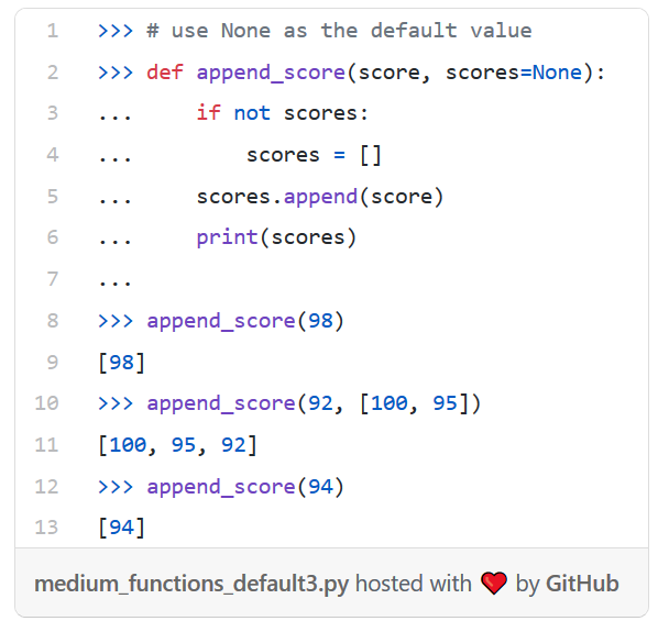 이런 실수를 피하려면 어떻게 하면 될까요? 뮤터블 자료형의 기본값으로 None을 쓰면 됩니다. 기본값이 None인 인자에 대해서는 미리 객체를 만들어두지 않기 때문입니다. 대신 함수 호출 시 scores를 생략했다면 함수 내부에서 만들어주어야 합니다. 아래는 이 사항들을 적용한 결과입니다. 예상한 대로 잘 동작하지요?