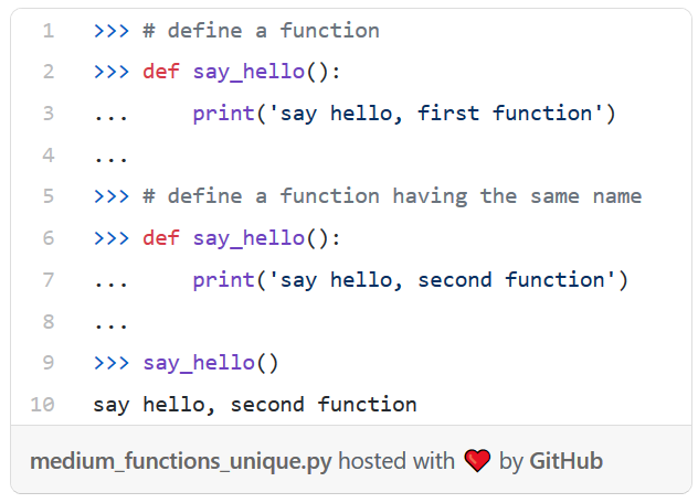매우 당연한 요구조건입니다. 파이썬의 모든 객체가 그러하듯 함수도 이름을 통해 구별합니다. 같은 이름으로 만들어진 함수가 있다면 IDE가 알려주거나, 혹은 먼저 정의된 함수가 무시됩니다. 아래 예시에서는 두 함수를 say_hello라는 하나의 이름으로 만들었습니다. 결과에서 보듯 두 번째 함수가 호출되었습니다.