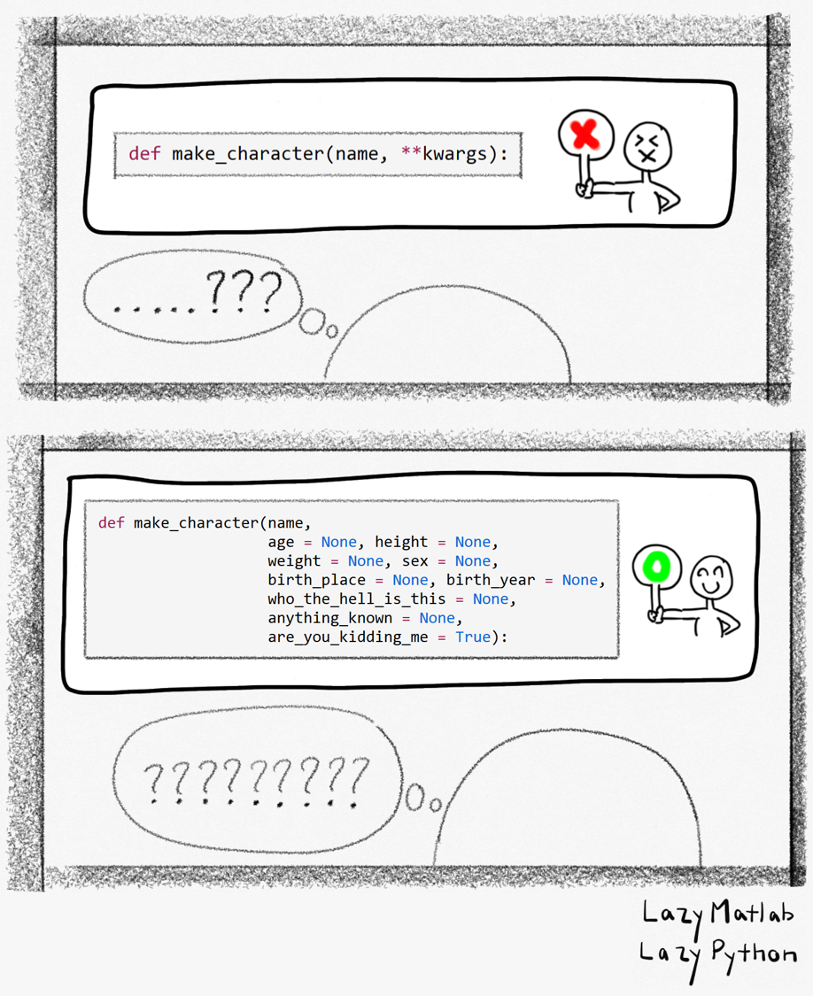 그런데 이렇게 만든 함수는 내부에서 **kwargs를 언패킹해야 할 뿐더러, 호출할 때 어떤 키워드 인자를 써야 하는지 미리 알기도 어렵습니다. 소위 전문가라는 사람들이 왜 이런 무시무시한 길이의 함수를 만든 걸까요? 전문가는 아래의 철학을 알기 때문입니다.
