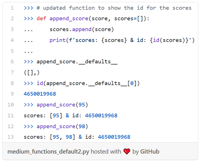 우선 함수를 호출하지 않아도 함수의 기본인자값과 이 값의 주소를 __default__ 속성을 통해 볼 수 있습니다. 그 후 함수를 두 번 호출했는데 같은 메모리 주소를 갖는 같은 리스트 scores가 사용되는 것도 볼 수 있습니다. (역자 주: 함수 호출 시 scores를 명시적으로 선언하면, 이때의 scores는 인자 기본값으로 설정된 scores와는 다른 메모리 주소의 리스트가 됩니다. 자세한 내용은 종욱 님의 블로그에서 보실 수 있습니다.)