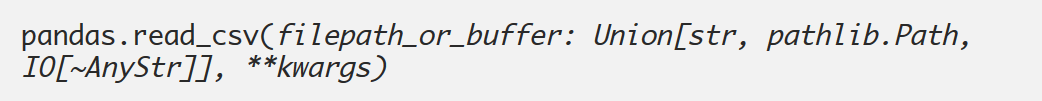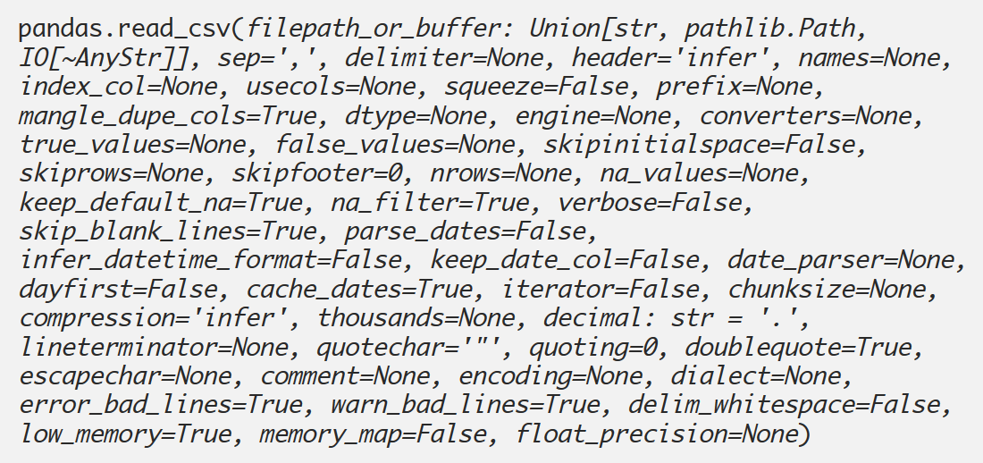 *args와 **kwargs가 함수 작성을 유연하게 만들어주는 것은 맞지만, 이를 너무 남용하면 오히려 함수 사용이 어려워집니다. 판다스의 read_csv 함수로 CSV 파일을 읽는 예제를 앞서 보여드린 바 있습니다. 이 함수가 총 몇 개의 인자를 받을 수 있는지 알고 계시나요? 공식문서를 보면 아래와 같이 나옵니다.