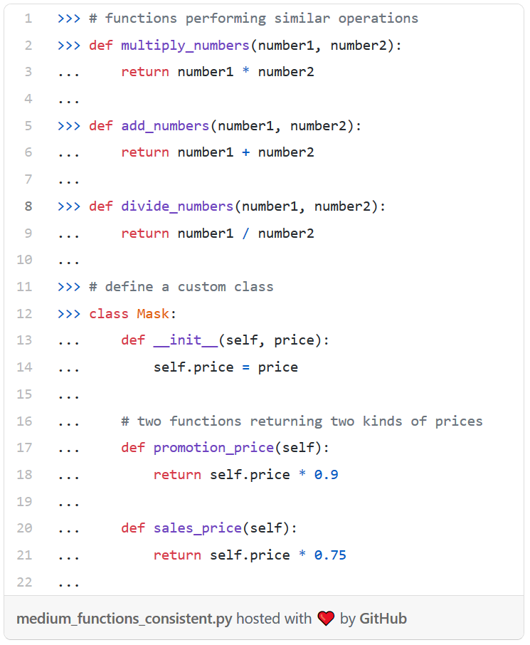 앞의 세 함수들은 두 수를 받아서 비슷한 동작을 하므로, 이름을 '동사+밑줄+numbers'의 형태로 지었습니다. Mask 클래스에는 promotion_price와 sales_price라는 두 함수가 있는데 비슷한 이름 구조를 갖도록 만들었습니다. 첫 단어는 가격의 종류를, 그 다음 단어는 반환값이 가격임을 표현하고 있습니다.