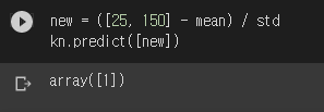 역시! 함정카드 발동! 스케일을 1:1로 맞추니 새로운 데이터와 가까운 5개의 점 중 4개가 빙어네요. 길이 숫자의 스케일이 너무 작아서, 다른 점들과의 거리를 구할 때 길이는 거의 기여를 하지 못합니다. 즉 사실상 무게만으로 분류를 하고 있었던 거죠. 만약 무게가 그램이 아니라 킬로그램이었다면 반대로 길이만으로 분류를 했을 겁니다.