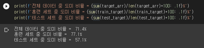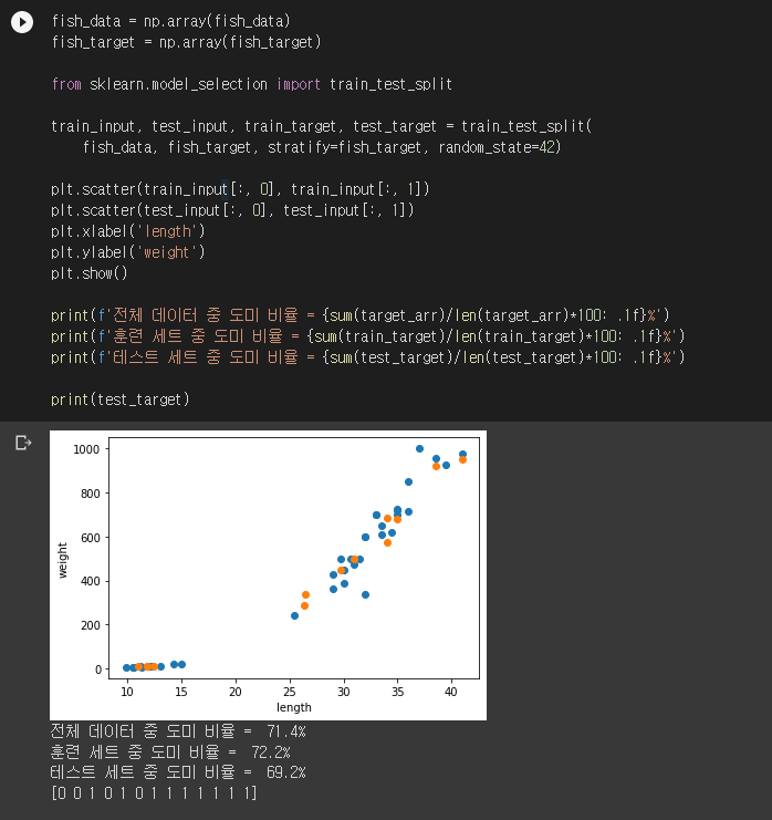 비율이 조금 안 맞군요. 전체 데이터는 도미:빙어가 35:14 = 5:2이므로 테스트 세트 14개 중 10개가 도미여야 합니다. 그런데 실제로 확인해보니 도미가 8마리밖에 안 들어있네요. 사이킷런에는 이 문제를 한방에 해결해주는 함수가 이미 준비되어 있습니다. train_test_split()을 stratify 파라미터와 함께 사용하면 원본 데이터의 비율을 유지하며 훈련/테스트 세트를 나눠주고 랜덤으로 섞어주기까지 합니다.