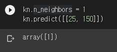 혹시 새로운 데이터를 분류할 때 최근접 데이터 1개만 보라고 하면 어떻게 될까요? KNeighborsClassifier의 n_neighbors 값을 직접 바꾸면 최근접 데이터를 몇 개 볼지 정할 수 있습니다.