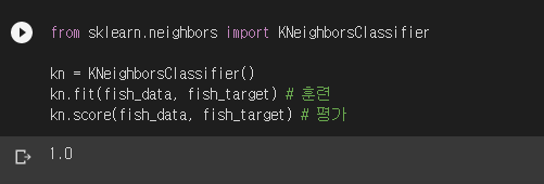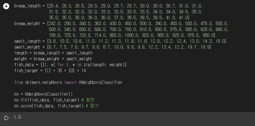 1장에서 생선 데이터(fish_data)와 정답(fish_target)을 이용해서 K-NN을 훈련시켰습니다. 그리고 동일한 데이터로 평가까지 진행했습니다. 스코어가 1.0이 나와서 행복했었죠.