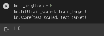 테스트 세트는 약간 맞지 않은데, 자연스러운 현상입니다. 평균과 표준편차를 훈련 세트로 계산했기 때문이죠. 이제 훈련과 평가를 해보겠습니다. 아까 테스트를 위해 바꿨던 n_neighbors도 다시 원래대로 5로 바꿉니다.
