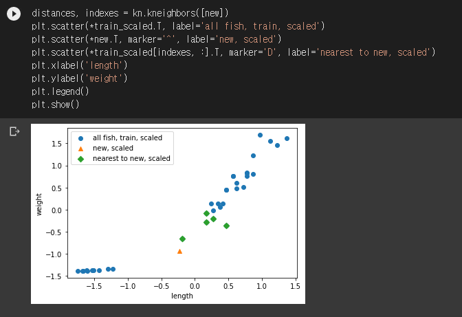 도미가 나왔습니다! 드디어 문제가 해결되었군요. 이제 모든 데이터를 표준점수로 바꿔 다시 그래프를 그려보겠습니다.