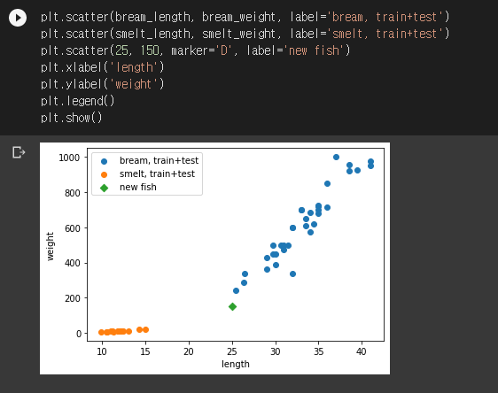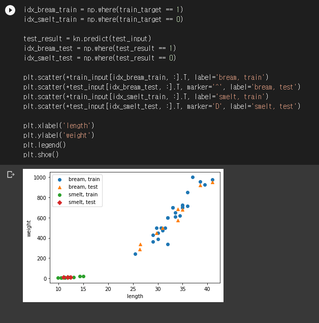 도미 테스트 세트는 도미로, 빙어 테스트 세트는 빙어로 잘 분류되었습니다. 예이- plt.scatter()를 좀 더 깔끔하게 쓰는 방법을 알려주신 페가님께 감사말씀 드립니다. 리스펙트!