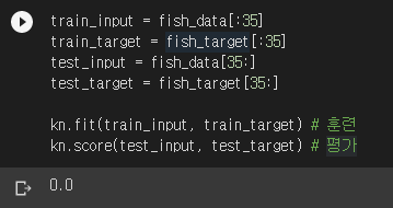 여기서 주의할 점이 있습니다. 전체 데이터는 35마리의 도미 데이터, 14마리의 빙어 데이터가 순서대로 들어있습니다. 즉, fish_data[:35]에는 도미가, fish_data[35:]에는 빙어가 들어있습니다. 이때 훈련 세트와 테스트 세트를 아래처럼 하면 어떻게 될까요?
