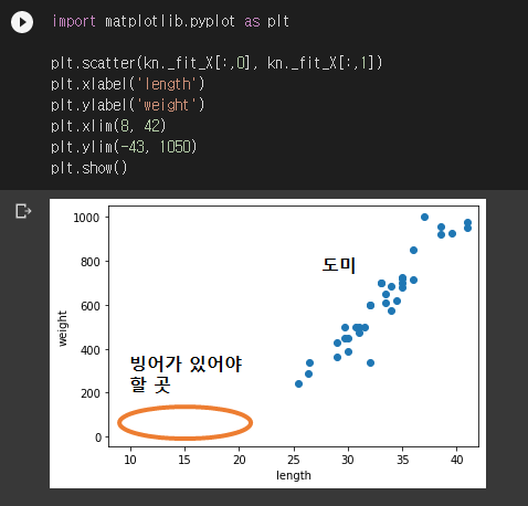 K-NN은 새로운 데이터가 들어오면 가까운 곳에 어떤 데이터가 있는지 찾아보고 분류합니다. 지금 kn에는 이렇게 도미 데이터만 들어있습니다. 빙어 데이터는 알지 못합니다. 그러니 새 데이터가 들어오면 무조건 도미로 분류하겠죠.