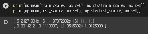 넘파이를 이용해서 아래와 같이 훈련 세트와 테스트 세트의 스케일을 맞춰줍니다.