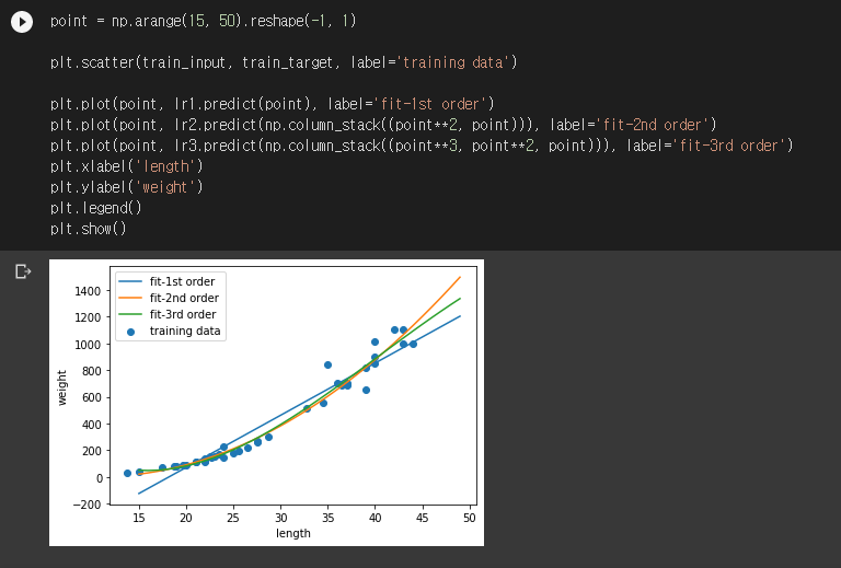 선형 회귀는 사이킷런의 LinearRegression 클래스를 사용합니다. 사용 방법은 앞에 나왔던 다른 클래스들과 비슷하나, 중요하게 다른 점이 있습니다. 다항식의 형태로 모델을 만들 것이므로, 다항식을 구성하는 각 차수의 데이터를 준비해줘야 합니다. 조금 전에 고차항을 새로운 특성처럼 다루기 때문에 선형 회귀라고 부를 수 있다고 했었죠? 농어의 무게를 길이의 2차식으로 모델링하겠다면 모델에 들어갈 입력의 각 행은 [길이**2, 길이]의 형태를 가져야 합니다. 사람은 0번째가 길이의 제곱, 1번째가 길이임을 알고 있습니다. 하지만 모델은 서로 다른 2개의 특성이 있는 것처럼 인식합니다. 이제 모델이 할 일은 타겟과의 차이가 최소가 되도록 각 특성에 곱할 계수를 찾는 것입니다. 책에서는 1차, 2차까지만 이용했는데, 저는 3차까지 해보겠습니다. 부피는 길이의 세제곱에 비례하니까요.