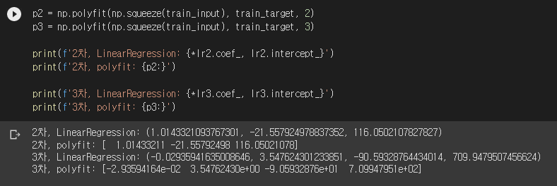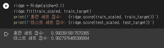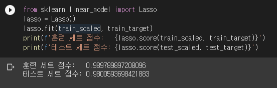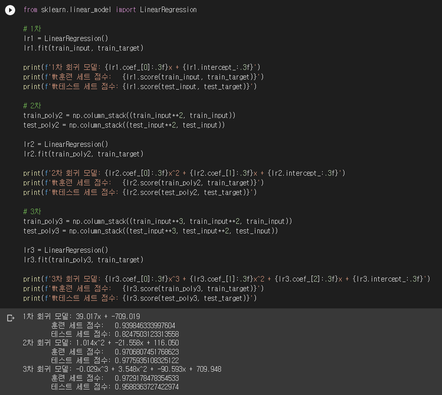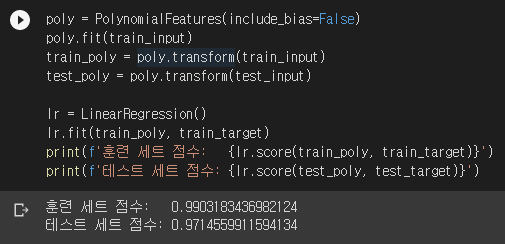 두 점수가 모두 높게 나왔군요! 과소적합 문제도 없어졌습니다. 무려 5차 회귀 모델임을 기억하세요.