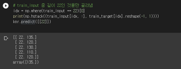 어라? 이것도 1이 안 나오네요. 여기에도 이유가 있습니다. 현재 train_input을 보면 길이 22짜리 농어가 5마리 있습니다. 이 5마리의 무게는 [135, 120, 130, 110, 120]입니다. 그래프를 그려보면 x축 22에 5개의 점이 겹쳐있겠죠. 이 모델에 길이 22인 새로운 농어 5마리가 들어오면 무게를 얼마로 예측해야 할까요? 각 농어에 무게 135, 120, 130, 110, 120를 분배할 근거가 없습니다. 실제로 확인해보니 135로 예측하네요. 모델의 k 값을 2로 했더니 [135, 120]의 평균으로, 3으로 했더니 [135, 120, 130]의 평균으로 예측하는 걸 보니 앞에서부터 k개만큼 사용하는 것 같네요.