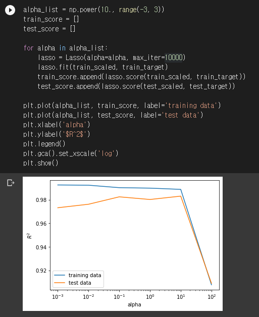 여기서도 $\alpha$는 하이퍼파라미터입니다. 릿지와 같은 방법으로 적절한 $\alpha$ 값을 찾아보겠습니다.