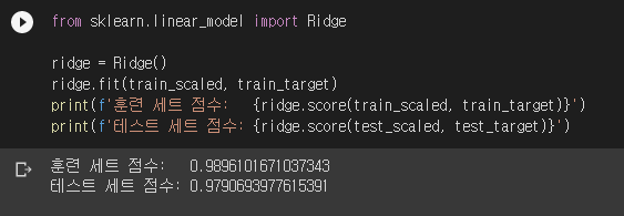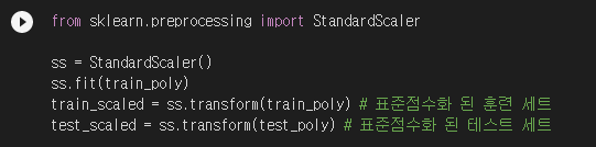 이제 회귀 클래스의 입력으로 train_scaled와 test_scaled를 넣으면 됩니다.