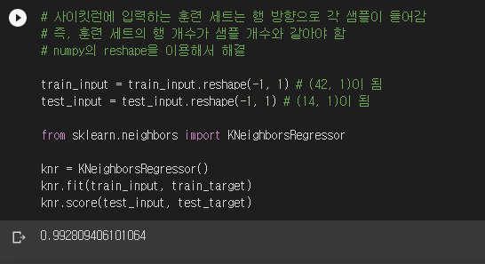 k-최근접 이웃 회귀 알고리즘은 사이킷런의 KNeighborsRegressor 클래스를 이용합니다. KNeighborsClassifier와 마찬가지로 fit() 메서드로 훈련시키고 score()로 평가합니다. 훈련시키기 전에 잠시 할 일이 있습니다. 훈련/테스트 세트의 차원을 맞춰주어야 합니다. 좀 전에 train_test_split으로 56개의 데이터를 42개의 훈련 세트와 14개의 테스트 세트로 나누었습니다. 훈련 세트의 shape은 (42, )입니다. 이 상태로 fit()에 입력하면 특성값 개수가 42이고 샘플은 1개인 걸로 인식합니다. 사이킷런은 훈련 세트의 각 샘플이 첫 번째 차원을 따라 놓여있는 것으로 받아들이기 때문입니다. 따라서 훈련 세트의 shape을 (42, 1)로 맞춰주어야 합니다. 정확히는 (n_samples, n_features)의 shape을 갖는 훈련 세트가 입력되어야 합니다. 관련 내용은 공식 문서에서 볼 수 있습니다.