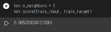 안 나오네요? 이유가 있습니다. KNeighborsRegressor도 KNeighborsClassifier와 마찬가지로 새로운 데이터가 들어왔을 때 가까운 데이터 몇 개를 확인할지 정할 수 있습니다. 기본값은 5입니다. 따라서 훈련 세트에 있던 샘플을 그대로 집어넣어도, 본인 외에 가까운 4개를 포함한 평균을 계산합니다. 원래의 타겟과는 달라질 수밖에 없습니다.