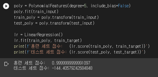 으악! 훈련 세트 점수는 기가 막힌데 테스트 세트는 엉망이다 못해 음수로 곤두박질 쳤군요. 전형적인 과대적합입니다. 차수를 높이면 훈련 세트는 점수가 높아질 수밖에 없습니다.