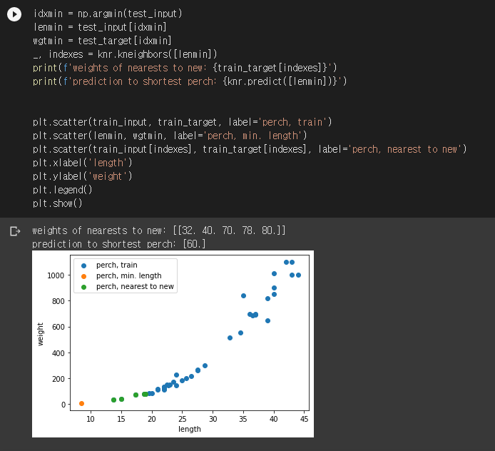 - 새로운 길이의 농어가 들어오면 길이가 비슷한 k개의 샘플을 찾는다.