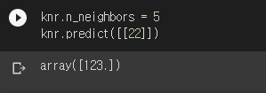 모델의 k 값을 다시 5로 세팅하고 길이 22짜리 농어의 무게를 예측하면, 길이 22인 5마리의 무게 [135, 120, 130, 110, 120]의 평균값인 123을 반환합니다.