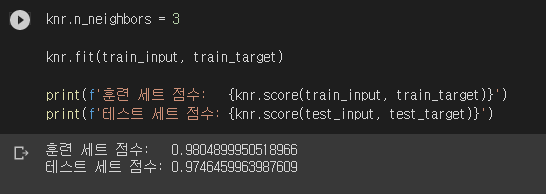 k-최근접 이웃 회귀에서 과소적합을 해결할 간단한 방법이 있습니다. KNeighborsRegressor의 n_neighbors 기본값은 5입니다. 이 값을 낮추면 됩니다. 모든 데이터에는 값의 변동fluctuation이 있습니다. 이 변동을 데이터의 특성으로 보고 변동에 맞추면 점수가 높아집니다. 이 변동에 맞추는 방법이 바로 k 값을 낮추는 겁니다. 5에서 3으로 줄여보겠습니다.