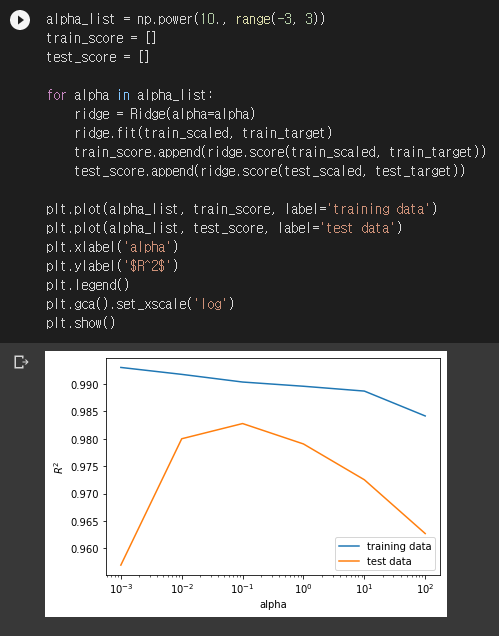 릿지 회귀에서 $\alpha$ 값은 모델이 학습할 수 없는 값입니다. 따라서 사람이 직접 지정해주어야 합니다. 이런 값을 하이퍼파라미터hyperparameter라고 부릅니다.