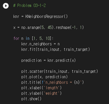 k-최근접 이웃 회귀에서 k값을 1, 5, 10으로 바꿔가며 모델의 성능을 확인하는 문제입니다. 코드와 결과는 아래와 같습니다.