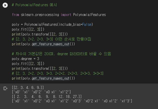 위 예시는 샘플이 [2, 3] 하나인 경우, 2와 3으로 만들 수 있는 모든 단항식의 값을 transform()이 반환한 결과입니다. get_feature_names_out()을 이용하면 아예 수식의 형태로 볼 수도 있습니다. 아참, 상수항은 없습니다. 사이킷런 모델은 상수항을 알아서 만들어주므로 PolynomialFeatures에 include_bias를 False로 입력했습니다.