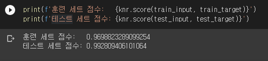 훈련시킨 훈련 세트보다 테스트 세트 점수가 조금 더 높네요. 이처럼 테스트 세트 점수가 훈련 세트보다 높거나, 두 점수 모두 낮은 경우 모델이 과소적합underfitting되었다고 말합니다. 반대로 훈련 세트 점수는 높은데 테스트 세트 점수가 낮으면 과대적합overfitting되었다고 말합니다. 과대적합은 이름 그대로 훈련 세트에만 잘 동작하도록 과하게 적합되었다는 뜻입니다.