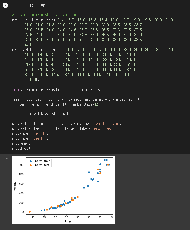 농어perch 56마리의 길이와 무게 데이터가 있습니다. 데이터를 훈련/테스트 세트로 나누고 그래프로 확인해보겠습니다.