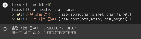 alpha가 10일 때가 가장 마음에 드네요. 이 값으로 라쏘 회귀를 해보겠습니다.