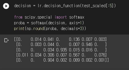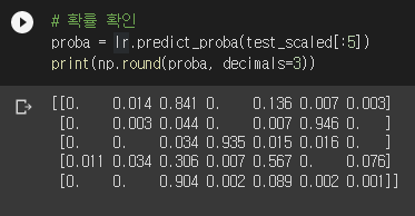 이제 생선 개체마다 z 값이 7개가 나옵니다. 이걸 소프트맥스 함수에 넣으면 확률이 계산됩니다. 확률은 predict_proba() 메서드가 계산해줍니다.