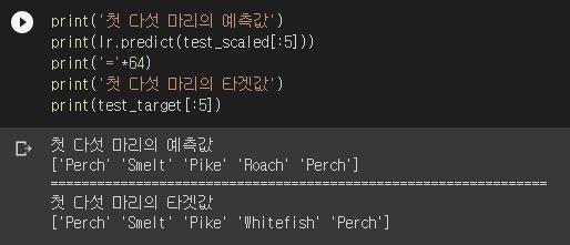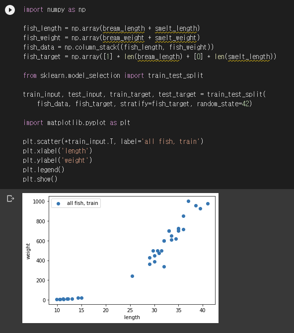 오른쪽의 요술봉을 누르니 UI가 인터랙티브하게 바뀌네요. 놀랍! 중요한 건 아니니 넘어갑니다. Species가 타겟이 되고 Weight부터 Width까지는 입력 데이터입니다. 데이터를 준비하고 훈련/테스트 세트로 나누고 표준화 전처리를 합니다.