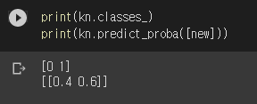 오호, 도미로 분류되었군요. 가까운 5개 중 3개가 도미, 2개가 빙어입니다. 어쨌든 3>2니까 도미이긴 한데… 결과도 참 어중간합니다. 그럼 이 생선은 도미일 확률이 60%, 빙어일 확률이 40%라고 얘기해도 될까요? 그 확률을 보여주는 메서드가 있습니다. predict_proba()입니다.