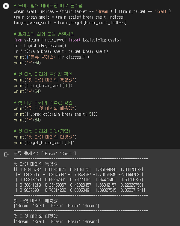 시그모이드는 임의의 실수에 대해서 $(0, 1)$ 범위의 값을 뱉어내므로 확률처럼 다룰 수 있습니다. 그럼 확률은 이걸로 만든다 치고, 각 특성에 곱할 계수는 뭘 기준으로 찾을까요? 수식 없이 개념적으로만 설명하자면, “정답의 확률은 최대한 높게, 오답의 확률은 최대한 낮게” 만드는 방향으로 계수를 찾습니다. 말이 좀 어려울 수 있으니, 일단 코드를 돌려보고 값을 이용해서 설명해보겠습니다. 우선 도미와 빙어만 분류하는 이진 분류입니다.