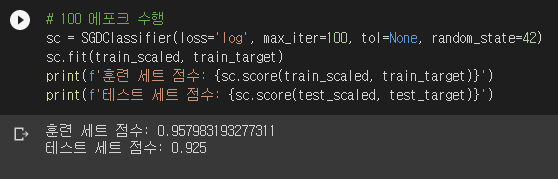 점수가 올라갔군요. 왜 테스트 세트의 점수가 교재와 다른지 의문입니다만, 일단 넘어가겠습니다. partial_fit()은 1 에포크만 실행합니다. 내부적으로 max_iter=1로 설정된다고 공식 문서에 잘 나와있네요.