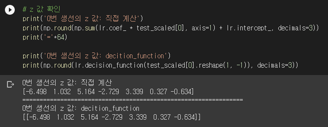 계수가 전부 음수네요? 다 이유가 있습니다. 잠시 뒤에 설명하겠습니다. 특성치를 이 식에 대입한 $z$ 값은 decision_function() 메서드를 이용하면 볼 수 있습니다.