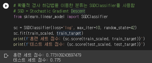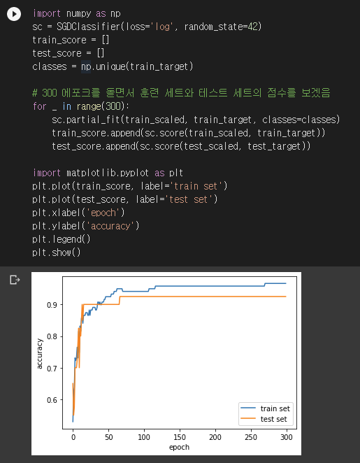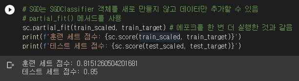 위 코드는 훈련 세트를 10 에포크를 실행한 겁니다. SGDClassifier 객체를 만들 때 설정한 max_iter 값이 fit()의 에포크 횟수가 됩니다. 결과를 보니 과소적합이군요. 에포크를 한번 더 실행해보겠습니다. 기존 모델을 추가 훈련시킬 때에는 partial_fit() 메서드를 사용합니다. partial_fit()은 기존에 학습한 계수와 절편을 업데이트 합니다. fit()은 이전에 학습한 계수와 절편을 모두 버리고 새로 학습합니다.