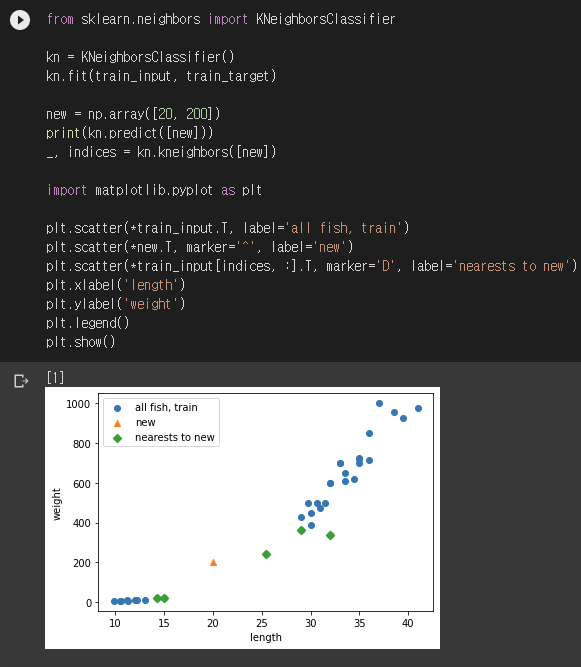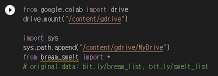 2장의 분류 문제를 다시 보겠습니다. 도미와 빙어의 길이 및 무게 데이터를 KNeighborsClassifier에게 모두 알려준 후, 새로운 생선이 들어오면 길이와 무게로부터 도미인지 빙어인지 분류하는 문제였습니다. 분류 기준은 가까이에 어떤 생선이 주로 있는지였습니다. 아래는 해당 코드입니다. 데이터 전체를 또 쓰기가 번거로워서 데이터를 구글 드라이브에 저장한 후 코랩으로 불러왔습니다. 방법은 여러 가지가 있습니다. 원래는 저자 분의 깃허브 링크에서 데이터를 바로 가져오고 싶었는데 깔끔한 방법을 찾지 못했습니다. (requests로 가져와서 eval 하는 것은 제가 원하는 방법이 아닙니다. 저는 eval을 싫어합니다.) 좋은 방법을 아시는 분은 알려주세요!