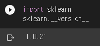 SGDClassifier의 파라미터 loss에서 손실 함수의 종류를 정할 수 있습니다. 여기에 ‘log’라고 적으면 로지스틱 회귀가 됩니다. loss의 기본값은 서포트 벡터 머신support vector machine(SVM)을 수행하는 ‘hinge’입니다. 알아둬야 할게 하나 있습니다. 코랩의 사이킷런은 v1.0.2입니다. 사이킷런 버전은 아래와 같이 알아낼 수 있습니다.