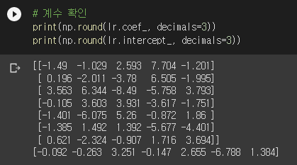 LogisticRegression은 분류 클래스의 개수에 따라 시그모이드를 쓸지 소프트맥스를 쓸지 알아서 정해줍니다. 공식 문서에 나와있는 내용입니다. 소프트맥스가 어떻게 적용되는지를 이해하려면 먼저 모델이 만들어내는 계수의 구조를 알아야 합니다. 일단 코드부터 돌리고 보겠습니다.