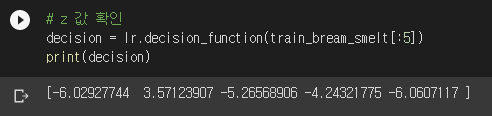 뭐가 엄청나게 많네요. 자세히 보니 coef_의 크기가 (7, 5)입니다. 따라서 coef_의 각 row가 각 생선 종류를 담당함을 알 수 있습니다. 즉, lr.coef_의 각 row와 0번 생선의 특성값을 내적하고 lr.intercept_를 더하면 0번 생선의 각 생선 종류에 대한 z 값이 나옵니다.