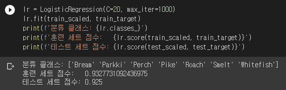 로지스틱 회귀는 사이킷런의 LogisticRegression 클래스를 사용합니다. LogisticRegression의 classes_ 속성에는 분류 클래스가 순서대로 들어있습니다. Bream이 0이고 Smelt가 1입니다. 첫 다섯 마리를 순서대로 도미, 빙어, 도미, 도미, 도미로 예측했습니다. LogisticRegression이 찾아낸 계수는 lr.coef_와 lr.intercept_에 들어있습니다.
