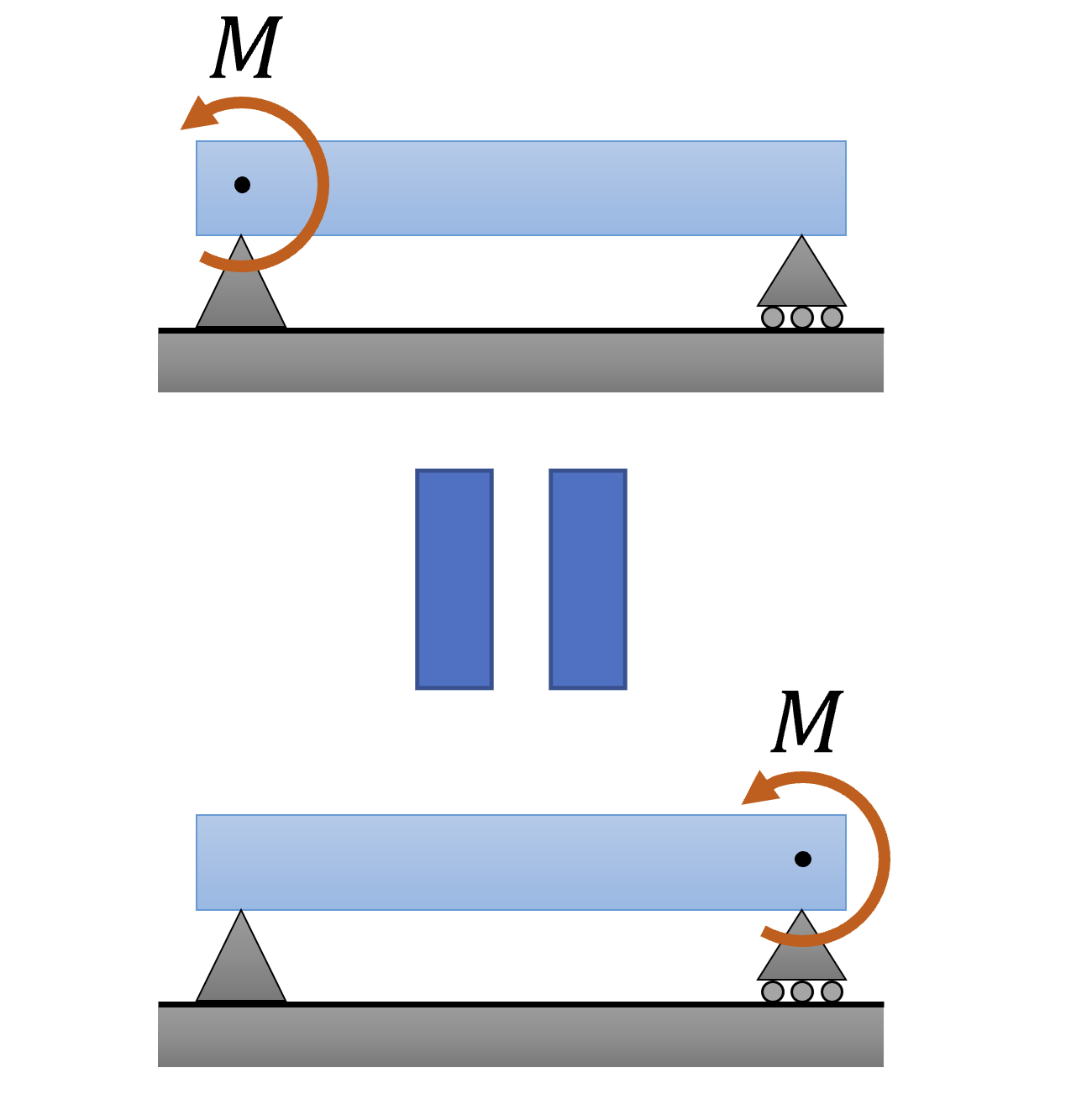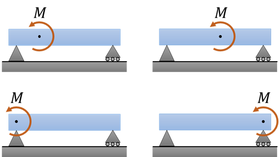 In statics, moments – or couples – are treated as “free vectors” which means that they can move freely unless the direction of application is changed. It implies that the point of application of moment is meaningless while that of force is not. Therefore, the beams shown below are exactly under the same condition as a point of view of statics. (But not of mechanics of materials! It should be carefully treated.) Reactions on supports are equal for all the cases.