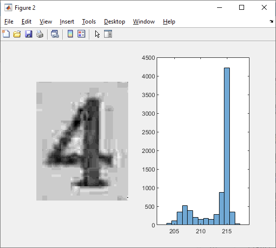 숫자가 명확히 보이고, 히스토그램에도 전경과 배경에 해당되는 두 peak이 보인다.
