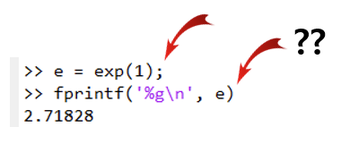 위 코드의 case 1은 fprintf로 문자열 출력만을 한 경우이다. case 2는 뜬금없이 fprintf의 반환값을 받았다. 실행 결과 우선 fprintf가 할 일인 문자열 출력을 했고, 그 다음 n에 6이 저장됐음을 알리고 있다. fprintf의 반환값은 fprintf가 방금 출력한 문자열의 길이이다. 5가 아니고 6인 이유는 \n도 하나의 문자이기 때문이다. case 3에서는 뒤에 세미콜론을 붙였으므로 문자열 출력만 하고 n에 대입연산을 한 결과는 출력하지 않는다.