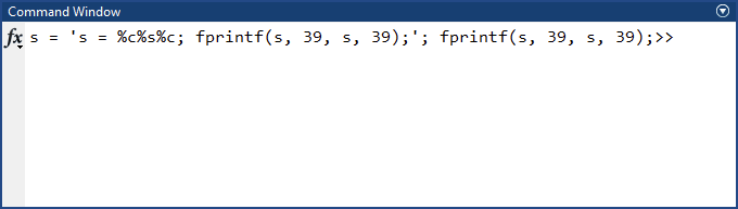 s = 's = %c%s%c; fprintf(s, 39, s, 39);'; fprintf(s, 39, s, 39);