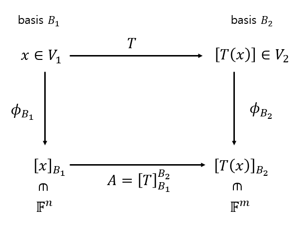 In the figure above, $T = \phi_{B_2}^{-1} A \phi_{B_1}$.